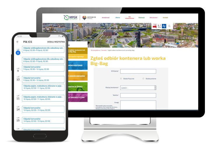 Harmonogram odbioru odpadów z generatorem pliku do kalendarza, formularz do elektronicznego zgłaszania…